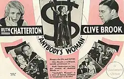 Anybody's Woman is a 1930 American pre-Code drama film directed by Dorothy Arzner and written by Zoe Akins and Doris Anderson, as based on the short story "The Better Wife", which had been written by Gouverneur Morris; the movie was formerly known as The Better Wife prior to changing the title.[1] The film stars Ruth Chatterton, Clive Brook, Paul Lukas, Huntley Gordon, Virginia Hammond, Tom Patricola, and Juliette Compton. The film was released on August 15, 1930, by Paramount Pictures.[2][3]