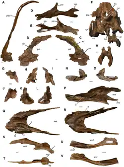 An additional four possible autapomorphies were identified in the referred specimens. The main body of the maxilla has no depression around the antorbital fenestra. The nasal branch of the maxilla is elongated and constructed like an inverted L. The branch of the jugal towards the quadratojugal is vertically deep. The same branch is forked at its rear end.[1]