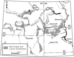 In 1998, Fred Nuss of Nuss Fossils discovered the first two partial skeletons of Anzu including the holotype CM 78000 on a private South Dakota ranch, both of which were mostly disarticulated and appeared to have been transported by a water current.[4][1][5] A third referred specimen, fragmentary skeleton MRF 319, studied by Tyler Lyson of the National Museum of Natural History, was discovered by Scott Haire, who spotted the bones at his uncle's ranch at Marmarth, North Dakota.[1] Sues later considered that these three partial skeletons were clearly from the same species.[6] The fourth referred specimen is a rear lower jaw fragment first reported in 1993, FMNH PR 2296 (formerly BHM 2033).[7][1][6]