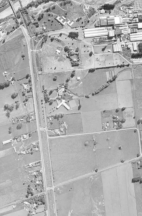 By 1959 there was still a shelter, platform and Borthwicks' private siding, which was the only source of local rail traffic after closure of the station on 10 August 1959.[10] A 1949 aerial photo seems to show a shelter,[12] where the 1967 photo (to the right) shows a white mark at the foot of the photo. In 1989 there was still a passing loop and private siding.[10]