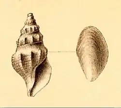(Original description) The shell is broadish, conical and sharply keeled. It has a shortish contracted base and a short snout, short narrow ribs, and spiral threads, a bulbous apex, strong, porcellaneous. Below the sinus area and about one third down the whorl from the suture arise, not quite abruptly, longitudinal ribs slightly tubercled at the top, straight, direct, narrow, and parted by shallow furrows about twice their breadth. They become feeble toward the lower suture. On the body whorl they do not continue to the base, and become broader and weaker toward the aperture. There are eleven on the last and penultimate whorls. On the first infra-embryonic whorl there are about seventeen, crowded, sharp, scarcely curved and oblique. The lines of growth are numerous and unequal. In the sinus-area they are sharp and delicate, on the rest of the shell coarse and puckered. Marginating the suture at the top of each whorl is a narrow scarcely swollen spiral band. Below this the sinus area is very finely, almost microscopically, scratched; and this scratch-sculpture is continued, though less distinctly, on the rest of the surface. The projection of the top of the ribs forms a sharp keel. The rib area is crossed by five coarsish threads, which rise into small tubercles on the ribs. One or two smaller threads come in between the lines of these spirals. The same sort of threads, but less distinct, are found on the base. Those on the columella and snout are a little more distinct. The colour is dull porcellaneous white. The epidermis is quite gone. The spire is rather short, conical, very slightly scalar, cylindrical toward the top. The apex consists of two smooth embryonic whorls, swollen and roundedly pressed down, with a deepish suture, rather more prominent than the regular whorl which follows. The shell contains 6+1⁄2 short whorls, of rather rapid increase. The body whorl is large relatively to the rest. From the suture to the ribbing they are concavely shouldered. The projection of the tubercles at the top of the ribs forms a carination. which does not really exist in the form of the whorls themselves. There is a very slight contraction towards the lower suture. The body whorl contracts slightly from the keel to the edge of the base, and from that point rapidly to the small, narrow, straight, and direct snout. The suture is coarse, slightly impressed, and well defined by the band below it. The aperture is narrowly oval, pointed above, with an oblique, short, rather open and gradually contracted siphonal canal in front. The outer lip is a rather depressed convex curve, a little concave at the top and flattened toward the point: on leaving the body it retreats at once, forming a shallow, blunt V-shaped sinus, from the lower side of which, with little of angulation, it advances very straight to the edge of the siphonal canal, whence it slowly curves backward round the open point of the snout. The inner lip spreads as a very narrow porcellaneous glaze. It runs very obliquely to the base of the shortish narrow columella, below which point it is a very little hollowed. The point of the columella is cut off with a very slight obliquity, and has a blunt and very slightly twisted edge. The operculum is small, oval, smooth, with hair-like striae. The apex is terminal The colour is pale brownish yellow.[2]