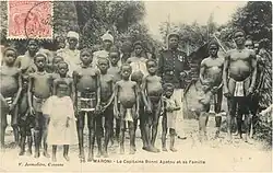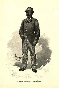 He returned to his village as a celebrity for not only having explored the Amazon, but also having visited France. He became the main negotiator with the French.[12] In 1881, he arranged that five children could go to school in Saint-Laurent-du-Maroni.[13] His close contacts with the colonial government, were a source of jealousy and rivalry within the tribe,[12] therefore Apatou founded the village Moutendé on the Maroni River in 1882[14] which quickly prospered.[12] In 1883, Apatou accompanied Henri Coudreau on his exploration of French Guiana.[15] On 7 September 1885, Jules Brunetti opened a Catholic mission in the village.[11] In 1887, Apatou was officially appointed Captain (village chief) under Granman Anato. He was recognized and received a salary from the French colonial government.[16]
