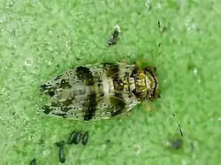 Aphalara itadori grows from egg to adult in 5 nymph phases over 33 days at 23 °C.[1] Overwintering adults survive in conifer tree bark. Once females are fully grown they can produce a mean of 637 eggs ± 121.96(±1SE, n = 11) with a mean period of production at 37.5 days ± 5.85 days (±1SE, n = 11).[1] Adult psyllids can live up to 67 days.