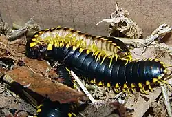 Apheloria tigana, known as the yellow-and-black flat millipede, is a large North American flat-backed millipede in the family Xystodesmidae. It is reported to secrete cyanide compounds as a defense. It is recommended that one wash hands after handling this organism as the toxic compounds it secretes are poisonous and can cause extreme irritation if rubbed in the eyes.