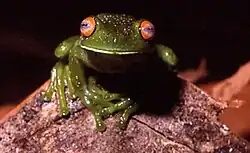 The Bocaina treefrog can grow to a snout-to-vent length of about 5 cm (2.0 in). It has a broad head and pointed snout, and vomerine teeth situated on the roof of its mouth. The large, bulging eyes have golden irises with a horizontal slit pupil, and the tympanum is easily discernible. There is a single vocal sac in the throat. Not only is the general colour of this frog green, but its muscles and bones are green, as well.[2] Several species of closely related tree frogs inhabit the Brazilian forest habitat. The Bocaina treefrog has distinctive, large granulations in the region of its cloacal vent, which helps to distinguish it from other species. Its tadpoles are also distinctive.[3]