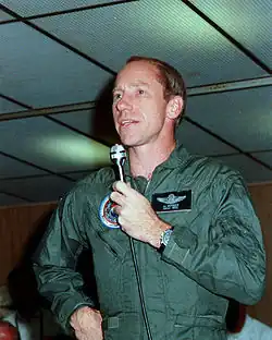 Eiermann lived in Cocoa Beach, Florida, near KSC, and was a local representative of Los Angeles-based Dyna-Therm Corporation,[17] a NASA contractor.[18] According to Scott's autobiography, one night several months before launch, the astronauts' supervisor, Director of Flight Crew Operations Deke Slayton, had Scott and the other crew members come to dinner at Eiermann's house; Scott described Eiermann as a longtime friend of Slayton.[19] In his autobiography, Worden concurred that the crew was invited to dinner there, but described Scott as inviting his crewmates, and did not mention involvement by Slayton.[20] In his testimony before a congressional committee in 1972, Scott described Eiermann as a "friend of ours", someone with whom he had dined and who knew many people at KSC, including some of the astronauts.[21] Scott also told the committee that he had met Eiermann at a party, rather than through another astronaut.[22]