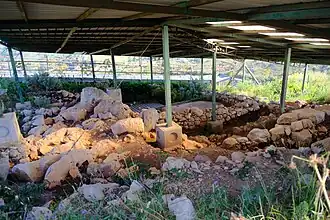 The city walls of isodomic limestone masonry still exist on the south and west sides. Remains of at least two buildings also in isodomic, lie on the E side of the plateau. On the top of the hill is a large rock-cut cistern.
