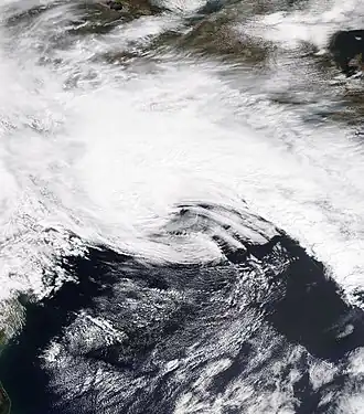 The April 2021 nor'easter, also referred to as the 2021 Spring nor'easter, was a significant late-season nor'easter that impacted much of New England with heavy snowfall, gusty winds, thundersnow, and near-whiteout conditions from April 15–17, 2021. The system originated from a weak frontal system late on April 14 over North Carolina, which moved into the ocean the next day and began to strengthen. The low-pressure steadily deepened as it moved up the East Coast, and developed an eye-like feature just prior to peak intensity. It prompted a fairly large area of Winter Storm Warnings across interior sections of New England, with Winter Weather Advisories being issued closer to the coast. Over 20,000 customers lost power at the height of the storm on April 16 due to heavy wet snow, and near-whiteout conditions were reported in many areas.[4] Several injuries, some serious, occurred as well, mostly due to traffic incidents on poorly-treated roadways during the storm.[5][6][7] Damage estimates from the system are currently not calculated.
