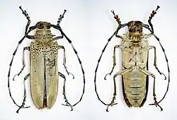 An adult beetle is 26-50mm in length[1] and narrower in width at around 15-16mm.[3] They are greyish-yellow, and their underside is black. The antenna are slightly longer than the body, in both males and females.[3]