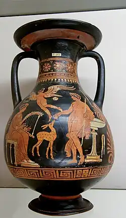 There are four principal forms. The first is a round-bottomed footless krater with side handles and a plate-like rim (cf. example 1); the second is a similar krater on a pedestal. This latter is the shape known in Picenum, where its occurrence at Novilara puts its date at least as early as 600BC. From the round-bottomed krater is evolved the most peculiar and characteristic product of Canosa, that is, the double-storied jar. The plate-like rim has been developed into a deep bowl, which becomes more and more exaggerated during the 5th century until eventually it takes up nearly half the height of the entire jar. Strange fanciful additions are then made in the way of plastic ornament. To the ordinary ring handles are added a third and even a fourth, of increasingly fantastic kind. They may take the shape of an animal's face, most like a cat or an owl, or be formed like a thumbless human hand, which had probably some talismanic value. The fourth principal shape of pot is that which is known in Greece as an askos (cf. example 2), derived originally from an ordinary goatskin, and know at an early date over much of Sicily and Italy, but perhaps introduced by the Greeks.[1][3]