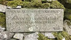 Aquae Arnemetiae was at the intersection of two main Roman roads: Batham Gate and The Street. Batham Gate (Old English for "road to the bath town") is a Roman road from Templebrough Roman fort in South Yorkshire past Navio Roman Fort and onto Buxton. Part of the route of this old Roman road on Tideswell Moor is a protected Scheduled Monument.[16] This was an important route for access to sites of lead production in the Peak District. There is still a road called Batham Gate road heading east out of Buxton. The Street road (Margary Number 71a) from Derventio (Derby) ran to Aquae Arnemetiae, followed in places today by the modern A515 road to the south of Buxton. The Street is still the name of the road in the Upper Goyt Valley that may have connected Buxton with Condate (Roman Northwich). There is plaque in a stone wall by The Street road near Arbor Low (at OS map location SK 1649 6232). It is marked "Aquae Armentiae Derventio" indicating the Buxton to Little Chester (Derby) Roman road. It is further inscribed: "Huius viae curam curatores viarum non susceperunt". This translates as "The road menders have not taken care of this road". Roman roads also led north to Mamucium (Manchester) and to Melandra fort, near Glossop (Margary Number 71b). Sections of agger from these two northbound rounds have been identified and excavated. There was also a Roman Road (Margary Number 713) between Buxton and Leek (which may be the Roman town of Chesterton) whose course joins the present A53 road towards Leek at Morridge Top.[17][18]