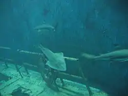 The largest aquarium is called "Fosse Aux Requins". It contains a false shipwreck in polyurethane resin (the iron would have rusted and the rust is toxic to fishes). Its glass is 23 centimetres thick to resist the water pressure.