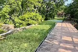 The area surrounding Aquetong Creek was occupied by the Lenape people until the lower portion of what is now Bucks County was acquired by the Penn colony. The Lenape called the spring "Achewetong" or "Achewetank" meaning "at the spring among the bushes". A Lenape village was located at the spring up until about 1690. On 1 November 1710, James Logan, secretary to Penn and later mayor of Philadelphia, was granted 600 acres (240 hectares) of land including the area of the spring. In 1707, Robert and Richard Heath built a gristmill along the Aquetong and on 2 November 1710, Richard was granted 1,000 acres (400 hectares) of land from the confluence of the Aquetong to the Delaware to include the lower Aquetong valley and the mill. A fulling mill was constructed as early as 1712 by Phillip Williams. The first sawmill on the Aquetong appeared in 1740. In 1747 Jonathan Ingham purchased the Logan tract and constructed a fulling mill below the spring, who passed it on to his son, Dr. Jonathan Ingham, who passed it on to his son, Samuel D. Ingham, famous as President Jackson's Secretary of the Treasury, who took possession in 1800. Later, Samuel likely abandoned the fuller mill and built the Ingham Springs Paper Mill, operating until his passing in 1860.[1] Aquetong Spring, as it was known by the Lenape, later known as Ingham Spring or the Great Spring, was said to have flowed as much as 3 million gallons per day. The spring flowed a short distance to a dam constructed in 1870 to produce Aquetong Lake or Pond, then flowed in Aquetong Creek generally eastward to the Delaware River in New Hope, PA. The dam has been recently removed to return the pond to its original pre-dam condition.[2]