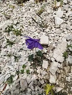Aquilegia iulia is endemic to the Julian Alps in northwestern Slovenia, growing on a wide ridge east of the mountain Krn[3] and on the Trnovo Forest Plateau.[5] It grows on calcareous rocky slopes[6] and rock crevices[5] at altitudes of 400–1,350 m (1,310–4,430 ft).[7] It is also found in black pine and Scots pine forests,[7] larch forests,[8] beech forests,[9] alpine meadows,[8] and occasionally in gravel river beds of the Trebušica and Belca rivers.[10]