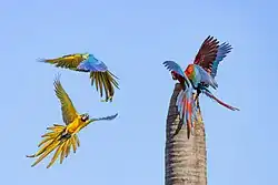 Two species of Ara, Ara ararauna and Ara chloropterus competing for space on a buriti tree in Minas Gerais, Brazil.