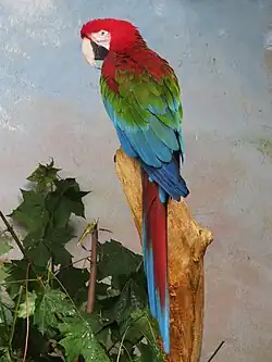 Macaws are known to have been transported between the Caribbean islands and from mainland South America both in historic times by Europeans and in prehistoric times by Paleoamericans. Parrots were important to the culture of native Caribbeans. The birds were traded between islands, and were among the gifts offered to Christopher Columbus when he reached the Bahamas in 1492. It is therefore difficult to determine whether or not the numerous historical records of macaws on these islands mention distinct, endemic species, since they could have been escaped individuals or feral populations of foreign macaws of known species that had been transported there.[16] As many as thirteen extinct macaws have at times been suggested to have lived on the islands until recently.[17] Only three endemic Caribbean Ara macaw species are known from physical remains; the Cuban macaw (Ara tricolor) is known from nineteen museum skins and subfossils, the Saint Croix macaw (Ara autochthones) is only known from subfossils, and the Lesser Antillean macaw (Ara guadeloupensis) is known from subfossils and reports.[16][18] No endemic Caribbean macaws remain today, and they were likely all driven to extinction by humans, some in historic, and others in prehistoric times.[19]