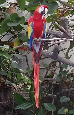 Like all macaws and most parrots, seeds and fruit are the major part of the diet of the genus Ara. The particular species and range of diet varies from species to species. Unlike many birds, macaws are seed predators not seed dispersers, and use their immensely strong beaks to open even the hardest shells. Their diet overlaps with that of some monkey species; in one study of green-winged macaws in Venezuela they shared many of the same trees as bearded sakis, although in some cases they ate the seeds at an earlier stage of ripeness than the sakis, when they contained more poison.[11] Macaws, like other parrots, may consume clay to absorb toxic compounds produced by some poisons.[12] As well, the toxic compounds of some foods may be neutralized by compounds, such as tannins, found in other foods consumed at the same time.