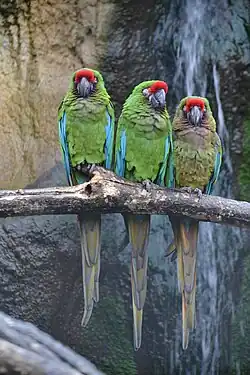 Like almost all parrots, the Ara macaws are cavity nesters.[13] The majority of species nest in cavities in trees, either live or dead. Natural holes in trees may be used, particularly those in dead trees, otherwise holes created by other species; in Mexico military macaws still use the cavities excavated by the now critically endangered imperial woodpecker. In addition to nesting in trees, the military macaw and green-winged macaw will also nest in natural fissures in cliffs. This nesting habitat is the only one used by the red-fronted macaws, as large enough trees are absent in its arid range.[14]