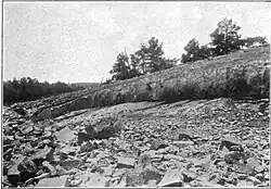 Like Stone Mountain, Arabia Mountain was quarried for decades before the property was turned over to the DeKalb park system. Structures and excavations from the quarry operations can be seen throughout the park. The stone quarried from Arabia Mountain, officially called "Tidal Grey", was prized for its high structural density and compressive strength as well as its "swirl" pattern. Tidal Grey Arabia Mountain can be seen in the construction of buildings for the U.S. Naval Academy, the Brooklyn Bridge, and street curbing in Atlanta as well as many other Georgia cities.[12] Prior to 1880, the stone was hand quarried, but starting in 1879 workers used drills, dynamite and air compressors to "raise a ledge" or sever a large block of stone from the mass. That allowed more control over the size of the stone, and large stones could be used for dimensional or building construction. The proximity to the railroad meant that the Tidal Grey could be easily transported across the country. In 1949, the Lithonia district produced nearly 1.5 million tons of granite valued at the time at $3 million.[13]