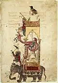 Arabic miniatures (Arabic: ٱلْمُنَمْنَمَات ٱلْعَرَبِيَّة, Al-Munamnamāt al-ʿArabīyyah) are small paintings on paper, usually book or manuscript illustrations but also sometimes separate artworks that occupy entire pages. The earliest example dates from around 690 AD, with a flourishing of the art from between 1000 and 1200 AD in the Abbasid caliphate. The art form went through several stages of evolution while witnessing the fall and rise of several Islamic caliphates. Arab miniaturists absorbed Chinese and Persian influences brought by the Mongol destructions, and at last, got totally assimilated and subsequently disappeared due to the Ottoman occupation of the Arab world. Nearly all forms of Islamic miniatures (Persian miniatures, Ottoman miniatures and Mughal miniatures) owe their existences to Arabic miniatures, as Arab patrons were the first to demand the production of illuminated manuscripts in the Caliphate, it wasn't until the 14th century that the artistic skill reached the non-Arab regions of the Caliphate.[1][2][3][4][5][6]