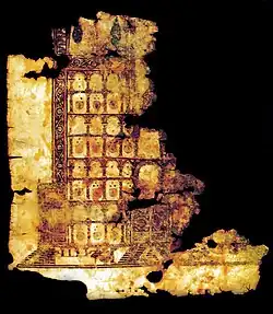 Written in the territory of modern Iraq in the Kufic script. Now kept in the Hast Imam library, in Tashkent, Uzbekistan.[42][43] Its verse endings are marked by small panels of diagonals lines; the tenth verse is marked with a square medallion illuminated in blue, green, red and manganese with a stellar design.[44]