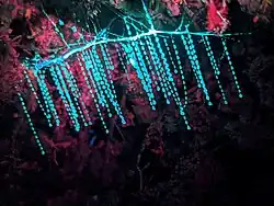 Arachnocampa luminosa (Skuse, 1891), commonly known as New Zealand glowworm or simply glowworm, is a species of fungus gnat solely endemic to New Zealand. The larval stage and the imago produce a blue-green bioluminescence.[2] The species is known to dwell in caves and on sheltered banks in the native bush where humidity is high, as moisture helps to maintain their silk structures that capture prey.[3][4] Its Māori names are pūrātoke, from the verb "to glow",[5] and titiwai, meaning "lights reflected in water."[6] This likely derives from the glowworms' presence near bodies of water,[7] where their luminous displays are reflected.