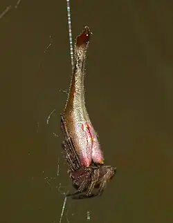 Arachnura feredayi, the tailed forest spider or scorpion-tailed spider[1], is endemic to New Zealand.[1][2][3][4][5] It is known for the distinctive tapering body shape in females, which are also much larger than males, and for producing vertical columns of egg sacs in their webs.[6]