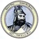 The legend about Aram is recorded in Khorenatsi's history. Khorenatsi writes that the legend was put into writing by Mar Abas Katina, a Syrian author.[17] Aram was the son of Harma and a descendant of the Armenian patriarch Hayk. The 18th-century historian Mikayel Chamchian, using information from Khorenatsi's history, placed Aram's reign in 1827–1769 BC.[5] He inherited the throne of his father, and became famous over the whole world, for the prudent and manly bravery which he displayed in the service of his country. He extended his dominion from the mountains of Caucasus to Mount Taurus, and drove all his enemies out of the country, who were very desirous to invade the territories of Armenia, and to oppress the people. Movses Khorenatsi remarks that "Aram chose rather to suffer death in defence of his country, than see it in subjection to foreigners."[18][19]