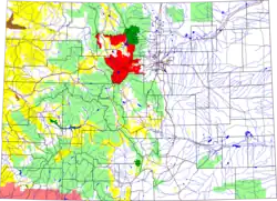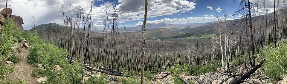 The Arapaho and Roosevelt National Forests were affected by five major wildfires (Cameron Peak, East Troublesome, Williams Fork, Lefthand Canyon and CalWood) in 2020, burning over 25% of their total lands.[3] The Williams Fork Fire was the largest wildfire Arapaho National Forest had ever experienced until it was surpassed by the East Troublesome Fire two months later.[4]