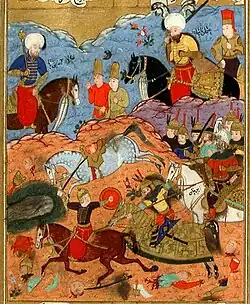 During the Ottoman–Safavid War (1578–1590), the Ottoman Empire sultan Murad III ordered the Crimeans to fight the Persians near the southwest corner of the Caspian Sea. Mehmed sent 20,000 men under his brothers Adil, Mubarak and Gazi. After a 3-month march along the north side of the Caucasus and down the Caspian coast in November they reached Safavid Shirvan (approximately modern Azjerbaijan) and joined Özdemiroğlu Osman Pasha. They completely defeated 25,000 Persians under Shirvan Beylerbey Aras Khan Rumlu who were besieging Shamakhi. The battle for Shamakhi began on 9 November 1578 and lasted for several days.[1][2] On the morning of the third day, the brother of the Crimean Khan, Adil Giray, at the head of 15 thousand Tatar horsemen, came to the aid of the Ottomans, this decided the outcome of the battle and the Safavids were defeated.[3][4][5] Aras Khan and his son were taken prisoners by the mirakhur Adil Giray and were executed.[6][7][8] The losses on both sides were enormous.[9][10]