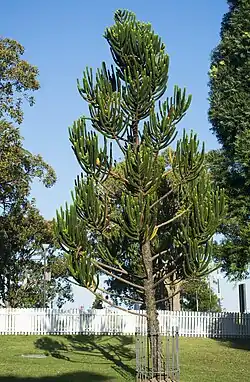 Araucaria rulei grows to around 30 meters in height, with long slender branches arranged symmetrically around the trunk, which extend horizontally and then turn upwards and branch out at the end, giving the tree an appearance sometimes compared to a chandelier. Male and female cones are produced on the same tree but on different branches, with branches at the top of the tree tending to produce female cones, while branches lower down make male cones. The cones stay on the tree for 2–3 years while the seeds ripen, which are around 3 cm long when mature.[2] It is a slow-growing plant with slow regeneration capabilities, though in its natural environment it is tolerant of both very dry conditions and high winds which many other species of araucaria will not tolerate. The species was named for an Australian nurseryman John Rule, and is sometimes grown as an ornamental tree in Australia, with its large smooth leaves and the symmetrical dome shaped growth habit of mature trees considered attractive.[3][4][5]