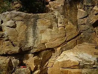 The Arcabuco Formation is characterised by a sequence of light- to pink-coloured fine quartzitic sandstones and conglomerates with red shales up to 50 metres (160 ft) in thickness intercalated.[1][3] In the Arcabuco Formation, in the Iguaque Anticlinal, dinosaur tracks have been found.[4] The overhanging rock shelter of Sáchica in Sáchica, Boyacá, consists of the sandstones of the Arcabuco Formation.