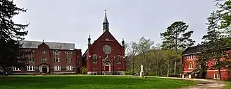 Ursuline Academy-Arcadia College Historic District is a national historic district listed on the National Register of Historic Places in 1998.[1] The district encompasses nine contributing buildings, four contributing structures, and one contributing object associated with Arcadia College. It developed between about 1889 and 1948 and includes representative examples of Romanesque Revival and Tudor Revival style architecture. They include a large brick chapel (1909); three-story, T-shaped administration building (1918); four-story classroom and dining hall (1914); three-story nun's house (1922); a large two-story priest residence (c. 1902); three-story brick laundry building (1889); carriage shed (1907); gymnasium (1930); spring house (1910); and stone grotto, stone bridge, and gateposts.[5]