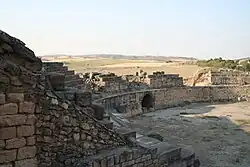 The site includes an amphitheatre, theatre, the city walls and gates, two thermal buildings or Roman baths, and the Forum. There is also a necropolis, and the circus (Roman race track) is being excavated - its outline can be seen from the top of the hill.[2]