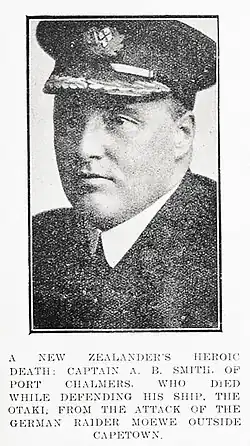 For most conspicuous gallantry and devotion to duty when in command of the S.S. "Otaki", on the 10th March 1917. "At about 2.30 p.m. on 10th March 1917, the S.S."Otaki", whose armament consisted of one 4.7 in. gun for defensive purposes sighted the disguised German raider "Möwe", which was armed with four 5.9 in., one 4.1 in. and two 22 pdr. guns, and two torpedo tubes. The "Möwe" kept the "Otaki" under observation for some time and finally called upon her to stop. This Lieutenant Smith refused to do, and a duel ensued at ranges of 1,900–2,000 yards and lasted for about 20 minutes. During this action the "Otaki" scored several hits on the "Möwe", causing considerable damage, and starting a fire which lasted for three days. She sustained several casualties and received much damage herself, and was heavily on fire. Lieutenant Smith, therefore, gave orders for the boats to be lowered to allow the crew to be rescued. He remained on the ship himself and went down with her when she sank with the British colours still flying, after what was described in an enemy account as "a duel as gallant as naval history can relate."[3]