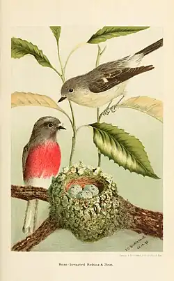In his text Campbell frequently refers the reader to Gould's illustrations of the birds that he (Campbell) is writing about, e.g. in his entry on page 87[16] for the Magpie Lark Grallina cyanoleuca Campbell notes that the bird is illustrated in: "Figure - Gould: Birds of Australia, fol., vol.ii, plate 54". However, he does also include in his own text several coloured illustrations (that of the Rose robin, for instance), drawn by artists.