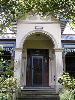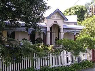 The house is rendered brick with hipped iron roof, decorative corner gables and impressive central gabled entrance portico. A bull-nosed verandah is supported on turned timber posts with cast iron valances and original timber venetian blinds. The front door has etched glass panels and sidelights; the windows are double hung with stained and etched glass. Internal details are almost all original: etched glass, doorknobs, fireplaces and surrounds, doorbell, rails and dados, pressed metal ceilings, light fittings etc. The room layout is reasonably sophisticated, intended to divide the maid from the family by means of a segmented hallway. In spite of a somewhat narrow verandah the building successfully modifies the climate with ventilated eaves, external venetian blinds and an elevated floor.[1]