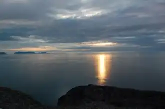 On the way to Arctic View, one drives through a wind farm that was built by Norsk Hydro. Here, at the edge of the Barents Sea, there is a view of the western part of Finmark county, and the place is a popular spot to watch the midnight sun, which can be seen from May 14 to July 31. The sun reaches its lowest point at 12:14–12:24 a.m. The most famous and popular place to view the midnight sun, North Cape, is located about 50 kilometres (31 mi) to the northeast.