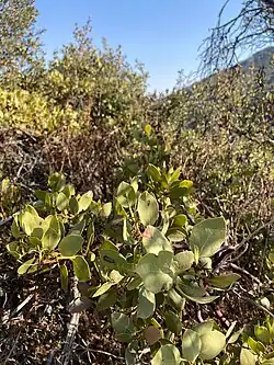 It was named for the community of Rainbow, California, near where it is most common in the chaparral of the lower elevation coastal Santa Ana Mountains, and the only manzanita species throughout most of its range.[2]