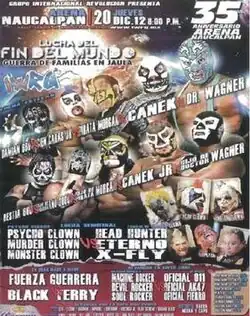 The Arena Naucalpan 35th Anniversary Show was an annual professional wrestling major event produced by Mexican professional wrestling promotion International Wrestling Revolution Group (IWRG), which took place on December 20, 2012 in Arena Naucalpan, Naucalpan, State of Mexico, Mexico. The show celebrated the 35th Anniversary of the construction of Arena Naucalpann, IWRG's main venue. The main event was a five team steel cage match contested under elimination rules. The teams were La Familia de Tijuana (Damian 666 and X-Fly), Los Hermanos Dinamita, Jr. (Hijo de Máscara Año 2000 and Máscara Año 2000, Jr.) and the father/son duos of Dr. Wagner, Jr. and El Hijo de Dr. Wagner, Jr., El Canek and El Canek, Jr. and Los Piratas (Hijo de Pirata Morgan and Pirata Morgan). Damian 666 was originally slated to team with his son Bestia 666, but was replaced by X-Fly. The match was contested under escape rules, which meant that the last team member in the ring would be the loser. Dr. Wagner, Jr. as well as Los Infierno Rockers and Los Psycho Circus who worked on the under card all appeared through IWRG's working relationship with fellow Mexican wrestling promotion AAA. The undercard also saw the continuation of the storyline feud between Fuerza Guerrera and Black Terry as well as a Torneo cibernetico elimination match between a team representing IWRG's wrestling school and a team representing Fuerza Guerrera's school Gimnasio Konkreto.