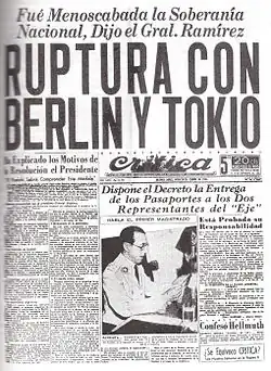 ![]() A newspaper announcing Argentina's severing of diplomatic relations with the Axis powers on 26 January 1944. | |