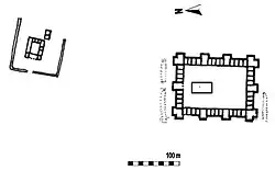 The building complex of the late antique praetorium (II) consisted of two buildings—a combined mansio (hostel)/praetorium (headquarters), and thermae (baths)—and was located in the “Westergass” area, 90 metres (300 ft) east of the Limesstrasse. The main building was oriented towards the highway, and was largely surrounded by a v-shaped ditch with a gate passage. It covered an area of 24 by 29 metres (79 ft × 95 ft). The much smaller bath an area of 7 by 14 metres (23 ft × 46 ft). Both were covered with tiled roofs, the roof tiles of which had been supplied by the Legio I Martia from Augusta Raurica. The buildings probably served as a road and rest station for state officials in transit, soldiers, and couriers of the imperial administration. In front of the Praetorium a well shaft was subsequently discovered. The praetorium and baths were probably built during the period between the rule of Constantine I or his sons and Valentinian I (330 to 340). They were in use until the 5th century. Post-roman use is proven by the indications of post holes. which come from half-timbered buildings that replaced the Roman buildings in the early Middle Ages. In their final phase, the buildings are likely to have made a neglected and run-down impression, as the residents and others disposed of their waste immediately in front of the entrances.[5]