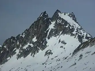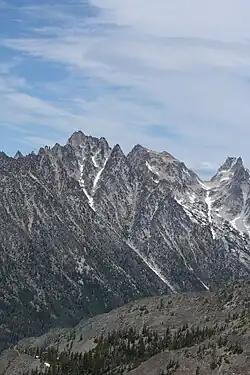 Argonaut Peak is a tall mountain in the Cascade Range in the U.S. state of Washington. Part of the Stuart Range part of the Wenatchee subrange of the Cascades, it is within the Alpine Lakes Wilderness of the Wenatchee National Forest and part of the region known as The Enchantments. At 8,453 feet (2,576 m) in elevation it is the 65th highest peak in Washington.[1] Located on the crest between Colchuck Peak and Sherpa Peak, Argonaut Peak has a southeast and a west summit of almost identical height, with the west being the true summit. There is a prominent southeast spire. Its southern side slopes down to the valley of Ingalls Creek. The north and northeast sides of Argonaut stand high above a branch of Mountaineer Creek, a tributary of Icicle Creek.[3] Argonaut Peak is 1.7 miles (2.7 km) west of Isolation Lake and 1.8 miles (2.9 km) east of Mount Stuart.[2]