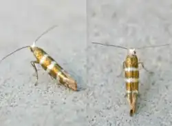 Argyresthia trifasciata, the juniper ermine moth, is a moth of the family Yponomeutidae. It is found in great parts of Europe,[1] but originates from the Alps. The forewings are shiny golden-brown with 3 silver-white transverse bands [2] The moth flies from May to September. [1].