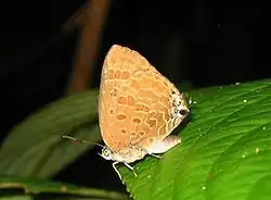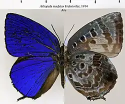 Arhopala is a very large genus of gossamer-winged butterflies (Lycaenidae). They are the type genus of the tribe Arhopalini. In the relatively wide circumscription used here, it contains over 200 species collectively known as oakblues. They occur from Japan throughout temperate to tropical Asia south and east of the Himalayas to Australia and the Solomon Islands of Melanesia. Like many of their relatives, their caterpillars are attended and protected by ants (myrmecophily). Sexual dichromatism is often prominent in adult oakblues.[1]