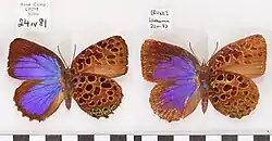 1. ^ Druce, H. H. (1895). "A monograph of the Bornean Lycaenidae". Proceedings of the Zoological Society of London. 1895 (3): 556–627, 4 pls.