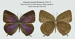 Arhopala meander, the bright oakblue, is a butterfly in the family Lycaenidae. It was described by Jean Baptiste Boisduval in 1832. It is found in the Australasian realm (Trobriand Island, Fergusson Island, Woodlar Island, New Guinea, Aru, Ambon, Waigeu, Louisiades, and Australia (Cape York)).[2]