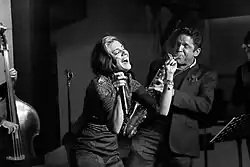 Savalas was introduced to Scott Bradlee in 2015 and began collaborating on online videos and touring with the band soon after. They have performed at venues such as Radio City Music Hall, The Greek Theater, and the O2 Academy in London.[14] Savalas was their first female emcee, and hosted the first-ever PMJ PBS special "Postmodern Jukebox: The New Classics". Savalas has garnered praise for her singing and also for her skill at jazz whistling.[15]