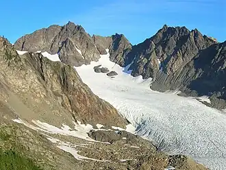 Aries is a 6,533-foot (1,991-metre) mountain summit located within Olympic National Park in Jefferson County of Washington state. Its neighbors include Mount Olympus, 2.46 mi (3.96 km) to the west, Athena 1.7 mi (2.7 km) to the southwest, and Mount Mathias 1.11 mi (1.79 km) to the northwest.[1] Aries is wedged between the Hoh Glacier and the Humes Glacier, and immediately northeast of Blizzard Pass. Precipitation runoff from the mountain drains into headwaters of the Queets and Hoh Rivers. This mountain was named by glaciologists Richard Hubley and Edward LaChapelle in 1955, in preparation for the International Geophysical Year.[4] It is named for Aries in keeping with the Greek and Roman mythology naming theme surrounding Mount Olympus.