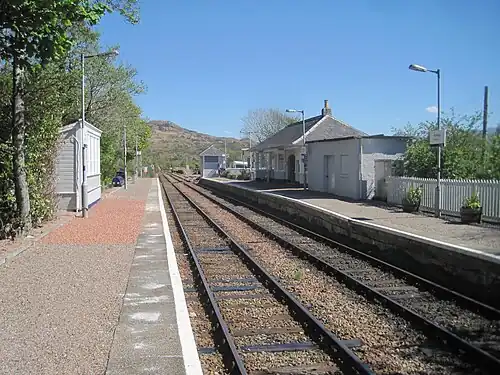 Arisaig railway station serves the village of Arisaig on the west coast of the Highland region of Scotland. This station is on the West Highland Line, measured 32 miles 2 chains (51.5 km) from the former Banavie Junction, near Fort William, between Beasdale and Morar on the way to Mallaig.[5] The westernmost station on the Network Rail network,[6] it is the only one of the four cardinal points of the national network that is not a terminus. ScotRail, who manage the station, operate all services.